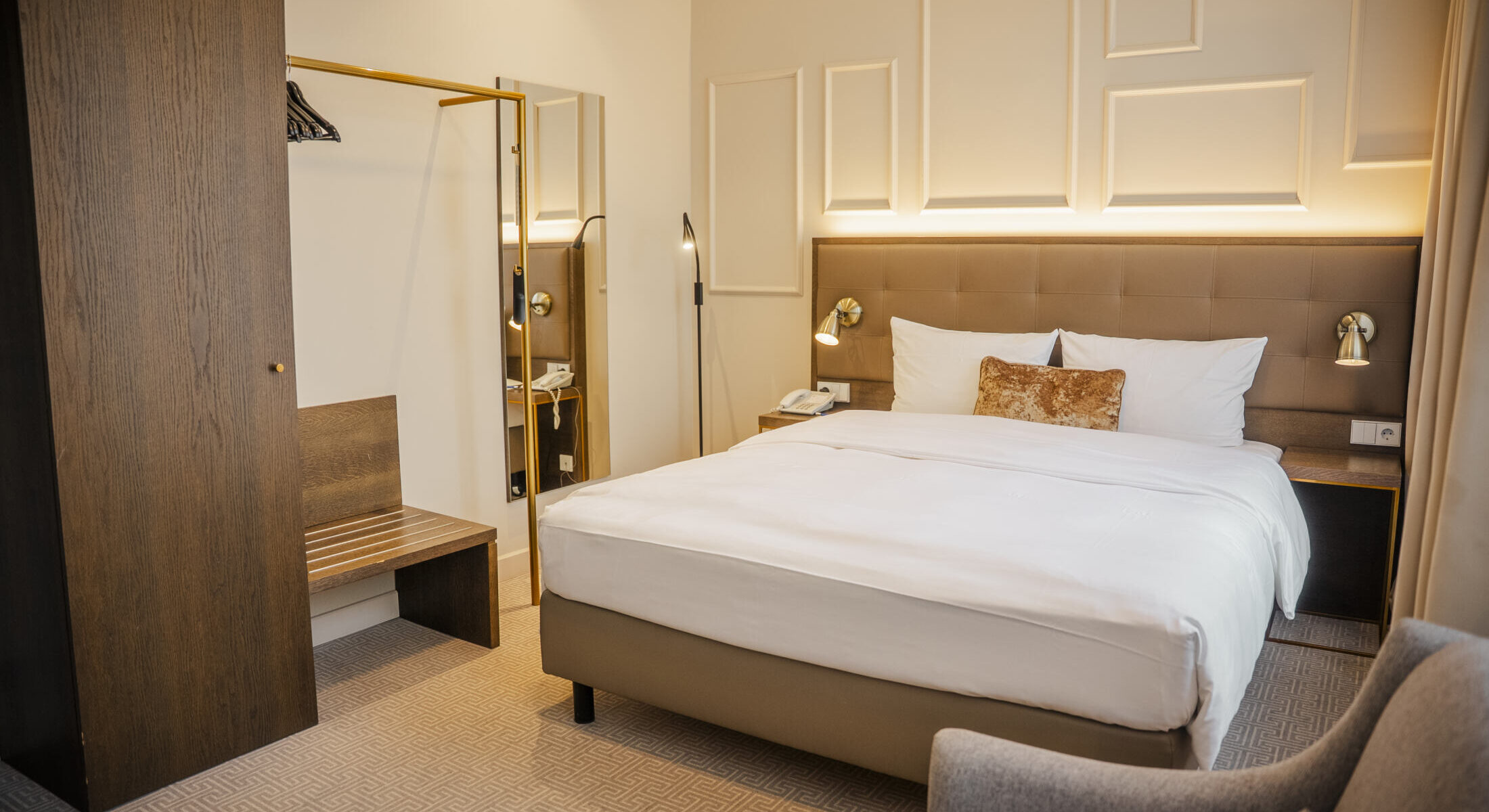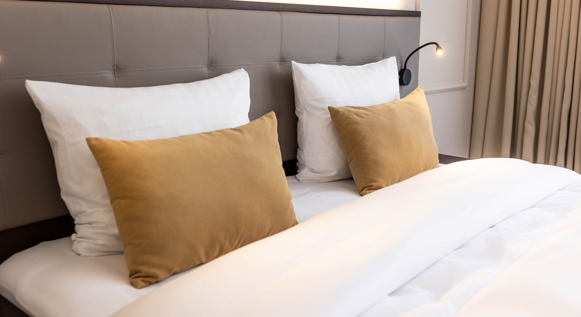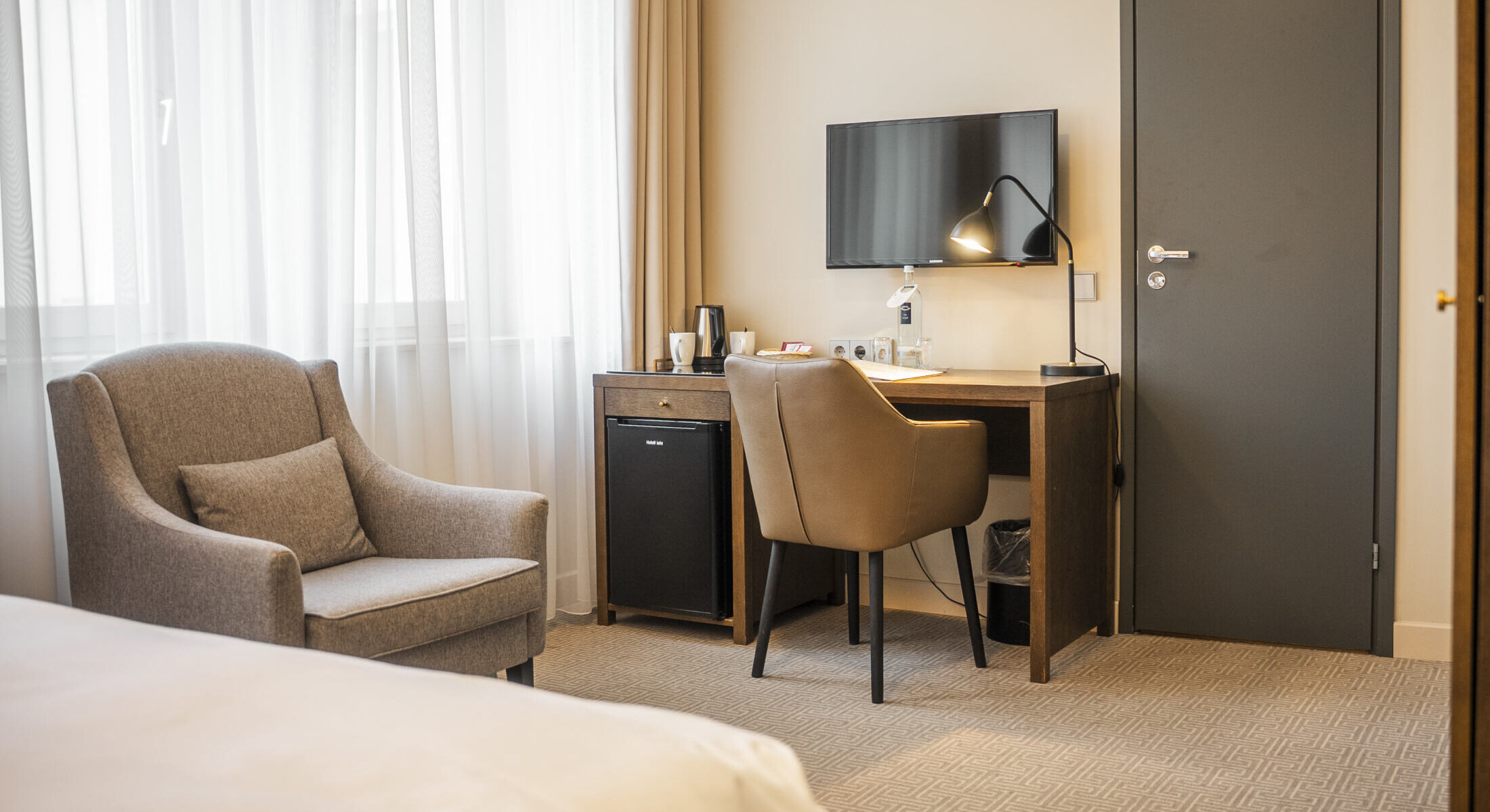 Stylishly and modernly designed in soft pastel tones, this room offers a peaceful atmosphere with a view of the courtyard or hotel entrance area.