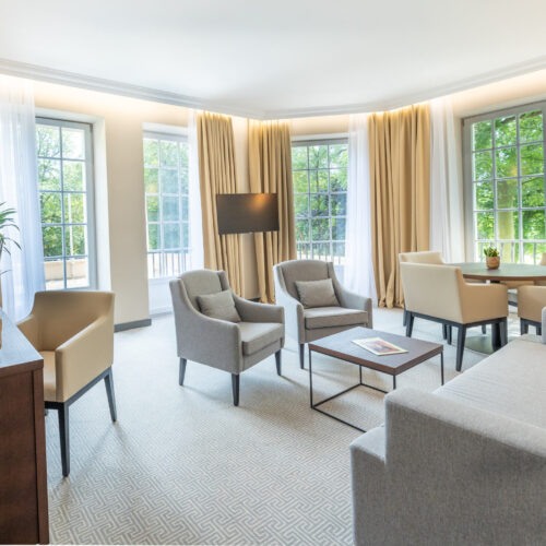 - Spacious living area – Sofa, armchairs, coffee table, dining table